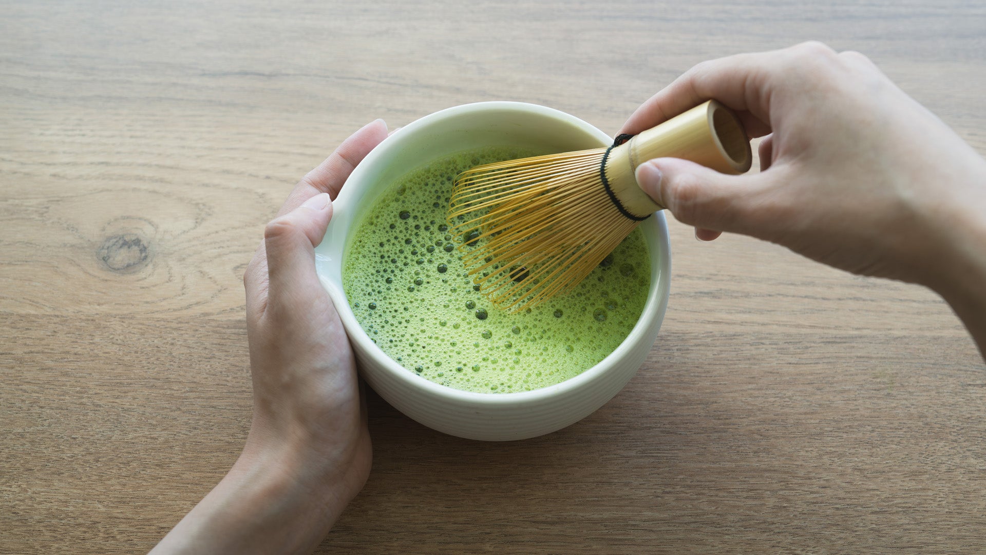 - Whisk briskly in a quick “M” motion until the matcha becomes foamy.
