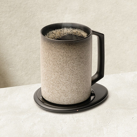 Hand-crafted ceramic self-heating mug made by artisans that keeps your drink hot and wirelessly charges your cell phone