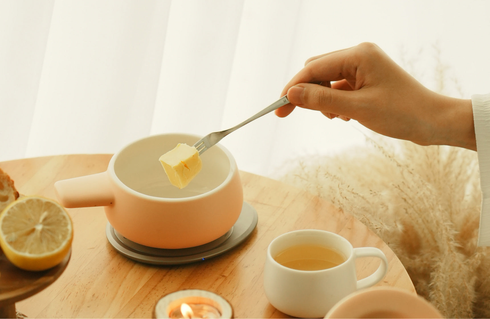 Experience the effortless pleasure of melting butter with the Fondi Self-heating Set. Quick, easy, and convenient, Fondi transforms the simple act of melting butter into a delightful sensory experience. Just place the butter in the fine ceramic Fondi and let it work its magic, producing a rich, aromatic melt that’s perfect for your breakfast or regular snacks.