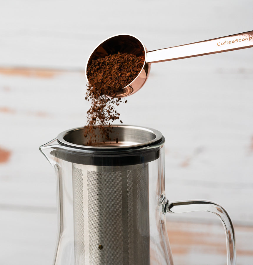 Each Sio Pitcher set includes a premium rose gold coffee scoop. The coffee scoop is perfectly sized to make one Sio glass of coffee per scoop, which also corresponds to the volume markers on the Pitcher, making it easy to brew the perfect amount for small or large gatherings.